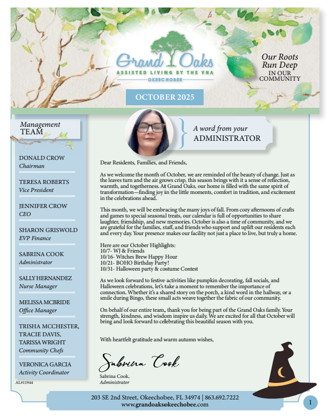 Once a month, Grand Oaks of Okeechobee prints a community newsletter, the Grand Oaks Leaflet, for our residents and their families to enjoy.